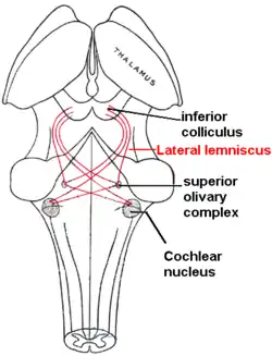 The sound information from the cochlea travels via the auditory nerve to the cochlear nucleus in the brainstem. From there, the signals are projected to the inferior colliculus in the midbrain tectum. The inferior colliculus integrates auditory input with limited input from other parts of the brain and is involved in subconscious reflexes such as the auditory startle response.