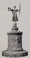 Munson's first acknowledged credit is Konti's marble statuary called Three Graces, unveiled in the new Grand Ballroom at the Hotel Astor in Times Square in September 1909.[1] She posed for all three Graces. Soon after that and for the next decade, Munson became the model of choice for the first tier of American sculptors, posing for a long list of freestanding statuary, monuments, and allegorical architectural sculpture on state capitols and other major public buildings. According to The Sun in 1913, "Over a hundred artists agree that if the name of Miss Manhattan belongs to anyone in particular it is to this young woman."[12] By 1915, she was so well established that she became Alexander Stirling Calder's model of choice when he became Director of Sculpture for the Panama–Pacific International Exposition held in San Francisco that year. Her figure was "ninety times repeated against the sky" on one building alone, atop the colonnades of the Court of the Universe, roughly modeled on St. Peter's Square in the Vatican.[13] In fact, Munson posed for three-fifths of the sculpture created for the event[3] and earned fame as the "Panama–Pacific Girl".[14]