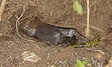 The species is colonial, nesting in small burrows and crevices in rocks and on earthy slopes on atolls and rocky islets. The breeding season varies according to location and subspecies, but how precisely is not very well-studied.[5] Both parents share the responsibility of incubating the single white egg (measurements of 52.5 by 36.2 mm and a weight of 37 g have been recorded for one specimen of average size[4]), each incubating for periods of 2 to 10 days until the egg hatches after 49–51 days of incubation. The nestlings are brooded for half a week to one week, after which time the parents will leave it mostly alone in the burrow and spend most of their time foraging and feeding their voracious offspring, which become very fat. Time from hatching to fledging is 62–75 days. Audubon's shearwaters take about 8 years to reach breeding age. As typical for Procellariiformes they are long-lived for their size, one bird ringed as an adult was still alive 11 years later; it must have been more than 15 years old at that time.[2]