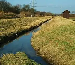 In the district of Bensheim-Auerbach, the Auer is split into two parts, one above ground and the other being a subterranean channel. Because of the recurring floods in the street Bachgasse, the largest part of the Auer was channeled in the 1980s.[2] Like at the antetype Freiburg Bächle, an ever constant part of the Auer flows openly through the Bachgasse, through the old village of Auerbach passing numerous half-timbered buildings towards the Bundesstraße 3 (Darmstädter Straße).