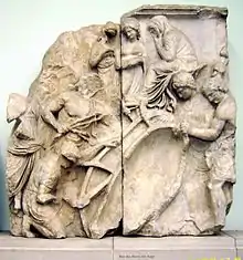 According to Pausanias, the tomb of Auge was still shown at Pergamon, where the Attalids venerated Telephus as a founding hero. Pausanias describes the tomb as "a mound of earth surrounded by a basement of stone and surmounted by a figure of a naked woman in bronze".[56] Auge also figures in several panels of the Telephus frieze on the 2nd century BC Great Altar of Pergamon: being seen by Heracles in the sanctuary of Athena (panel 3); waiting shrouded and mournful, as carpenters build the wooden vessel she will be shut up in, and cast adrift at sea (panels 5 and 6); being found on the shore by Teuthras (panel 10); establishing the cult of Athena (panel 11); arming Telephus (panels 16, 17); being given in marriage to Telephus, by Teuthras (panel 20); and recognizing and being recognized by Telephus (panel 21).[57]