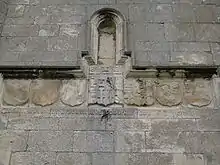 All Saints Church, Aughton is located at the far end of the village and overlooks vast expanses of the floodplains of the River Derwent. Tucked away in the village, it can only be accessed on foot through a small gate and field adjacent to Aughton Hall. An historic church, famous for its association with Robert Aske, leader of the insurgents in the Pilgrimage of Grace, October 1536. Aske was executed for treason on 12 July 1537.[2] The church displays a mixture of architectural designs as it has been altered throughout the years, but is noted especially for its Norman arch between the chancel and nave. On the chancel floor a well-preserved ancient brass of a knight in 15th century plate armour and his lady can be found, although much of the lady is now missing. Standing in the churchyard and looking up at the tower, (which was rebuilt by Christopher Aske sometime after 1536), a shield with six quarterings can be seen engraved on the outside wall, now badly weathered but it offers the following inscription in old French text: "Christofer le second filz de Robert Ask chr oblier ne doy, Ao Di 1536." This is literally translated as: "Christopher, the second son of Robert Aske, chevalier, ought not to forget the year of our Lord 1536." Also on the tower is a benchmark of the time and carved, in sunk relief, a newt or salamander otherwise known in Old English as an Ask.