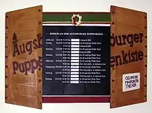 The wooden box does not only feature prominently in the name of the theatre, but also inspired the trade mark of the Puppenkiste: the representation of the two top cover flaps of a wooden box. Across the top covers, the name "Augsburger Puppenkiste" is printed, along with the addition "Oehmichens marionette theatre". These box lids have long since become the official trade mark of the Puppenkiste. Every single film or theatre-production starts with a small sequence of the top covers being opened. In the actual theatre, the stage is covered by two enormous box lids (0,90x 2 metres). For the TV productions, special cover flaps were produced: they are smaller and modeled to fit the screen format with the aspect ratio 4:3. These very box tops were used mostly unchanged since the end of the 1950s in almost all TV productions of the Puppenkiste. For the production of "Der Raub der Mitternachtssonne" (The theft of the midnight sun) (1994), a so-called "Insertkasten" (insert box) was designed to fit the screen aspect ratio of 16:9, which is respectively longer than the usual 4:3 format.
