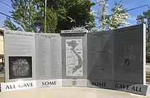 The memorial was finalized in August 2019, with the placement of a Vietnam-era bronze Soldier's Cross, a granite pedestal, four engraved granite benches, four additional granite mantle pieces, and four bronze recognition plaques.[5]