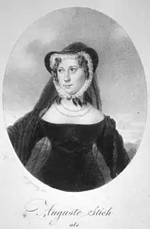 Stich died under tragic circumstances. Gebhard Bernhard Carl Blücher von Wahlstatt (1799-1875), a grandson of the famous Feldherrn, was a second lieutenant in the Guard Hussars and had a rendezvous with Auguste Stich on 6 February 1823, as he wanted to say goodbye to her before a long journey. In the stairwell, he met her husband, whom he injured with his dagger after a brief heated argument.[1] Blücher was sentenced to three years' imprisonment which he served at the Wisłoujście Fortress.[2]