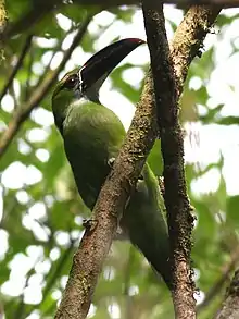 Green toucanets[1] are near-passerine birds from the genus Aulacorhynchus in the toucan family. They are native to Mexico, and Central and South America. All are found in humid forests and woodlands in highlands, but a few also occur in adjacent lowlands.[2] They are relatively small toucans, 30–44 centimetres (12–17 in) long, with colorful, mainly green, plumage.[2] They are typically seen in pairs or small groups, and sometimes follow mixed species flocks.[3]