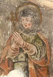 "Saint Aure" represented in a 17th-century mural carrying a miniature Crucifix. At the Roman Catholic church in Tohogne, Belgium.