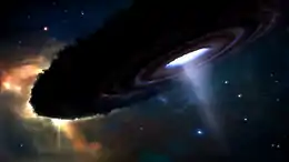 The most prominent variable star in Auriga is Epsilon Aurigae (Al Maz, Almaaz),[9] an F0 class eclipsing binary star[44] with an unusually long period of 27 years; its last minima occurred in 1982–1984 and 2009–2011.[2][10][17] The distance to the system is disputed, variously cited as 4600[44] and 2,170 light-years.[73] The primary is a white supergiant, and the secondary may be itself a binary star within a large dusty disk. Its maximum magnitude is 3.0, but it stays at a minimum magnitude of 3.8 for around a year; its most recent eclipse began in 2009.[17] The primary has an absolute magnitude of −8.5 and an unusually high luminosity of 200,000 L☉, the reason it appears so bright at such a great distance.[44] Epsilon Aurigae is the longest-period eclipsing binary currently known.[9] The first observed eclipse of Epsilon Aurigae occurred in 1821, though its variable status was not confirmed until the eclipse of 1847–48. From that time forward, many theories were put forth as to the nature of the eclipsing component. Epsilon Aurigae has a noneclipsing component, which is visible as a 14th magnitude companion separated from the primary by 28.6 arcseconds. It was discovered by Sherburne Wesley Burnham in 1891 at the Dearborn Observatory, and is about 0.5 light-years from the primary.[41]