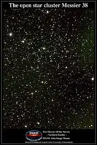 M38 is a diffuse open cluster at a distance of 3,900 light-years, the least concentrated of the three main open clusters in Auriga;[41] it is classified as a Trumpler Class II 2 r or III 2 r cluster because of this.[89] It appears as a cross-shaped or pi-shaped object in a telescope and contains approximately 100 stars;[41] its overall magnitude is 6.4.[9][10] M38, like M36, was discovered by Guillaume Le Gentil in 1749. It has an apparent diameter of approximately 20 arcseconds and a true diameter of about 25 light-years. Unlike M36 or M37, M38 has a varied stellar population. The majority of the population consists of A and B type main sequence stars, the B type stars being the oldest members, and a number of G type giant stars. One yellow-hued G type star is the brightest star in M38 at a magnitude of 7.9.[41] The brightest stars in M38 are magnitude 9 and 10.[89] M38 is accompanied by NGC 1907, a smaller and dimmer cluster that lies half a degree south-southwest of M38; it is at a distance of 4,200 light-years.[17] The smaller cluster has an overall magnitude of 8.2 and a diameter of 6.0 arcminutes, making it about a third the size of M38. However, NGC 1907 is a rich cluster, classified as a Trumpler Class I 1 m n cluster. It has approximately 12 stars of magnitude 9–10, and at least 25 stars of magnitude 9–12.[89]