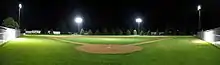 The ballpark's concession stand, bathrooms, and in-ground dugouts were installed for the 2002 season, its original Dakotronics scoreboard was installed for the 2003 season, its lights during the 2004 season (purchased by the city, with crane installation donated by the then new local ethanol plant, Verasun Energy. Players and their families provided volunteer labor for the lighting install. Due to inoperability, the original scoreboard was replaced with an equivalent model, refurbished Dakotronics scoreboard in late 2019, during the Langland dedication (thanks to the orchestration of Alex Ohm, friend and legion teammate of Jake Langland). In 2021, Bob Shelden Field (Brookings, SD) was renovated, and half of the original "Wenande Pressbox” (named for donator, Rick Wenande) was relocated by Terry Anderson to Langland Field and installed on an elevated platform behind the home plate bleachers. Prior to this, Langland Field had no pressbox. In 2022, and due to city drainage issues, the city extracted the in-ground dugouts in favor of above-ground dugouts to-be-built for the 2023 season.