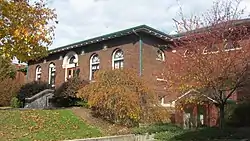 The current Aurora Library building was constructed by the Cincinnati architectural firm of Garber & Woodward in 1913–1914, with a small rear addition designed by the same firm and added in 1923. It is a one-story, "T" plan, Renaissance Revival style red brick building on a raised basement. It has a low hipped roof, round arched openings, and terra cotta ornament.[3]: 5, 7