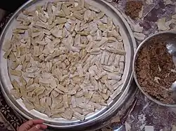 Aush jushpare (آش جوش پَره) is a type of aush (Iranian thick soup/stew), commonly cooked in Khorasan, Gonabad, Ferdous and Sabzevar in Iran. It is similar to the Chinese jiaozi. Historian Bayhaqi (-1077) mentioned about Aush Jushpare in his book "Tarikh-i Bayhaqi". Aush Jushpare is one of the oldest Aush, but since it takes a lot of time for preparation, it is not commonly eaten now. It is rather a dish of hospitality, which people eat on the occasion of special gatherings or festivals. Traditional guest house restaurant serves Aush Jushpare as local specialty. Aush Jushpare was registered as intangible heritage of Iran on 5 January 2021.[1][2]