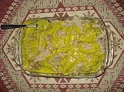 Aush is typically made with a variation of ingredients but may include; flat wheat noodles, turmeric, vegetables (broccoli, carrots, onion, celery, spinach, garlic, jalapeño), legumes (chickpeas, kidney beans), herbs (dill, mint, coriander, minced cilantro), yogurt and ground lamb, beef or chicken.[3][4][5][6]