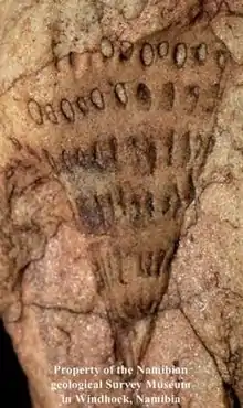 Ausia fenestrata is a curious Ediacaran period (630 – 539 million years ago)[2] fossil represented by only one specimen 5 cm long from the Nama Group, a Vendian to Cambrian group of stratigraphic sequences deposited in the Nama foreland basin in central and southern Namibia.[1] It has similarity to Burykhia from Ediacaran (Vendian) siliciclastic sediments exposed on the Syuzma River of Arkhangelsk Oblast, northwest Russia.[3][4][5] This fossil is of the form of an elongate bag-like sandstone cast (Nama-type preservation) tapering to a cone on one end. The surface of the fossil is covered with oval depressions ("windows") regularly spaced over the surface in the manner of concentric/parallel rows. The taxonomic identity of Ausia is unresolved.