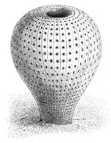 - Ausia may represent ascidians (sea squirts),[8] an invertebrate group related to the chordates.[5][9] Results of a new study of a Burykhia from Russia have shown a possible affinity of these organisms to the ascidians, which are urochordates. The Russian species is more than 90 mm across, and the rows of oval depressions are separated by structures which were probably grooves in the internal wall surface of the living organism. The study's authors interpret these fossils as the internal sand casts of a vast bag-like cavity, possibly a pharynx or branchial basket.[5] The animals represented by these two genera were thought to live in the shallow waters of an epicontinental sea, slightly more than 555-548 million years ago, and the authors feel this is probably the oldest evidence of the chordate lineage of metazoans.[5]