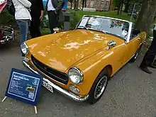 The next upgrade was presented at the London Motor Show in October 1966.[10] Besides receiving the larger 1275 cc engine (which disappointed enthusiasts by being in a lower state of tune than that of the Mini-Cooper 'S'), the Mark IV and its cousin the Mark III MG Midget had several changes which were more than cosmetic. Most notable is the change from a removable convertible top, which had to be stowed in the boot, to a permanently affixed, folding top of greatly improved design, which was much easier to use. Separate brake and clutch master cylinders were fitted, as car manufacturers' thoughts began to turn to making their products safer.[11] On US market versions the larger engine sacrificed some of its performance from 1968 on, through the use of smog pumps and other modifications to comply with federal emission control requirements. 1969 was the final year the Sprite was exported to the US. At the same time reversing lamps were made a standard fitment and the cars' electrical system was switched to negative earth and powered by an alternator rather than a dynamo. This was also the first year that reclining seats were fitted.