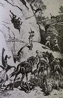This force was consolidated and trained by Walker at Deniliquin before traveling to the Darling River where the first Aboriginal attack occurred 100 miles below Fort Bourke at a place called Moanna, resulting in at least 5 natives being killed by the troopers.[47] In 1849 he mobilised his force north beyond the MacIntyre River to conduct missions to police the out-stations.[48] Once arriving on the Macintyre River on 10 May 1849, the force checked the aggressions of the local Aboriginal people, and when trying to capture six Aboriginal men charged with murder, there were "some lives lost". They were then deployed to the Condamine River where the "Fitzroy Downs blacks" were routed and another group were "compelled to fly" from the area.[49] One of these skirmishes was described as a dawn raid on an Aboriginal encampment where around 100 native people were killed and two Native Police troopers were fatally injured.[50]