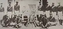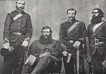 Australian native police were specialised mounted military units consisting of detachments of Aboriginal troopers under the command of white officers appointed by colonial governments.[1] These units existed in various forms in colonial Australia during the nineteenth and, in some cases, into the twentieth centuries. From temporary base camps and barracks, Native Police were primarily utilised to patrol the often vast geographical areas along the colonial frontier in order to conduct indiscriminate raids and punitive expeditions against Aboriginal people.[1][2] The Native Police proved to be a brutally destructive instrument in the disintegration and dispossession of Indigenous Australians.[2] Armed with rifles, carbines and swords, they were also deployed to escort surveying groups, gold convoys and groups of pastoralists and prospectors.