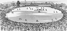 The game around this time was defensive and low-scoring, played low to the ground in congested rugby-style scrimmages. The typical match was a 20-per-side affair, played with a ball that was roughly spherical, and lasted until a team scored two goals.[27] The shape of the playing field was not standardised; matches often took place in rough, tree-spotted public parks, most notably the Richmond Paddock (Yarra Park), known colloquially as the Melbourne Football Ground.[38] Wills argued that the turf of cricket fields would benefit from being trampled upon by footballers in winter,[39] and, as early as 1859, football was allowed on the MCG.[40] However, cricket authorities frequently prohibited football on their grounds until the 1870s, when they saw an opportunity to capitalise on the sport's growing popularity. Football gradually adapted to an oval-shaped field, and most grounds in Victoria expanded to accommodate the dual purpose—a situation that continues to this day.[40]