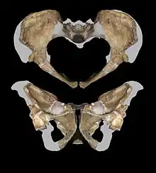 The pelvis shares several traits with early Homo and H. ergaster, as well as KNM-ER 3228 from Koobi Fora, Kenya, and OH 28 from Olduvai Gorge, Tanzania, which are unassigned to a species (though generally are classified as Homo spp.) There was more buttressing along the acetabulum and sacrum improving hip extension, enlargement of the iliofemoral ligament attachment shifting the weight behind the centre of rotation of the hip, more buttressing along the acetabulum and iliac blade improving alternating pelvic tilt, and more distance between the acetabulum and the ischial tuberosity reducing moment arm at the hamstrings. This may have allowed a humanlike stride in A. sediba. The hip joint appears to have had a more humanlike pattern of load bearing than the H. habilis specimen OH 62.[1] The birth canal of A. sediba appears to be more gynaecoid (the normal human condition) than those of other australopiths which are more platypelloid, though A. sediba is not completely gynaecoid which may be due to smaller neonate brain (and thus head) size. Like humans, the birth canal had increased diameter sagittally (from front to back) and the pubis bone curled upwards.[14]