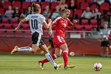 Scene from the game against Switzerland with Nina Burger and Rahel Kiwic (SUI).