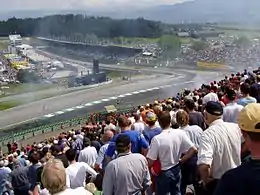 The Austrian Grand Prix has been held at two different locations in southeastern Austria, being originally held in Zeltweg, about 70 km (43 mi) west of Graz. Since 1969 the Austrian Grand Prix has taken place in neighbouring Spielberg, with the two venues being within approximately 4 km (2.5 mi) of each other.[1] It was first held at the Zeltweg Air Base for six years, before a permanent track, originally called the Österreichring and later known as the A-1 ring and Red Bull Ring, was built.