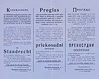 The occupational authorities were gripped by the fear of levée en masse and of civilians taking up arms. The Austro-Hungarian Army consequently employed the seizure of hostages from the general population and the burning of villages in punitive raids as a means of quelling resistance. These measures, as well as summary executions, were all permitted under section 61 of the Dienstreglement[lower-alpha 5] (k.u.k army regulations).[79] Disarming the populace was done by holding village elders responsible for handing over a certain quota of weapons that were judged to be held before the war began.[81] The sentence for possession of a weapon was death by hanging. Military courts also tried civilians for newly defined offenses, including the crime of lèse-majesté.[82]