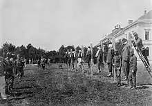 Mass killings took place in numerous towns in northern Serbia. On 17 August 1914, in the Serbian town of Šabac, 120 residents—mostly women, children and old men, who had previously been locked in a church—were shot and buried in the churchyard by Austro-Hungarian troops on the orders of Feldmarschall-Leutnant Kasimir von Lütgendorf.[8] The remaining residents were beaten to death, hanged, stabbed, mutilated or burned alive.[9] A pit was later discovered in the village of Lešnica containing 109 dead peasants who were "bound together with a rope and encircled by wire"; they had been shot and immediately buried, even with some still alive.[10] Wawro writes that in Krupanj, men of the 42nd Home Guard Infantry Division, the exclusively Croat formation known as the Devil's Division,[lower-alpha 1] bashed a group of old men and boys to the ground using rifle buttstrokes and then hanged any who were still breathing.[6]