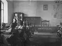 The occupational authorities considered Serbian national consciousness an existential threat to Austria-Hungary. Thus, the policies of the Military Governorate were aimed at depoliticising and denationalising the Serbian population.[75] Public gatherings and political parties were banned, the Cyrillic script was termed "dangerous to the state" (German: staatsgefährlich) and banned from schools and public spaces, streets named after people perceived as being significant to Serbian national identity were renamed, the wearing of traditional Serbian clothing was proscribed and the Gregorian calendar replaced the Julian. Additionally, all Serbian students had to be educated in the German language, according to Austrian academic standards and through teachers imported from Austria.[76]