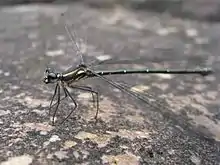 It is a medium-sized to large, black and pale yellow damselfly, often with some pruinescence on adult bodies .[4] Like other members of the Megapodagrionidae, it rests with its wings outspread.[6]