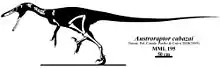The type specimen of Austroraptor cabazai, holotype MML-195, was recovered in the Bajo de Santa Rosa locality of the Allen Formation, in Río Negro, Argentina. The specimen was collected in 2002 by the team of Fernando Emilio Novas of the Museo Argentino de Ciencias Naturales. It consists of a fragmentary skeleton including parts of the skull, lower jaw, a few neck and torso vertebrae, some ribs, a humerus, and assorted bones from both legs. The specimen was prepared by Marcelo Pablo Isasi and Santiago Reuil. In 2008, the type species Austroraptor cabazai was named and described by Fernando Emilio Novas, Diego Pol, Juan Canale, Juan Porfiri and Jorge Calvo. The genus name Austroraptor means "Southern Thief," and is derived from the Latin word auster meaning "the south wind" and the Latin word raptor meaning "thief." The specific name cabazai was chosen in honor of Héctor "Tito" Cabaza, who founded the Museo Municipal de Lamarque where the specimen was partially studied.[1]