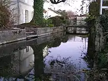 [13] The chateau is moated with the moat fed by the Dandelot. It is a construction from the 16th century which was largely redesigned in the following centuries. The guard tower and the front door of the castle date back to 1580 and the angled wing with mullioned windows dates to 1606. - The Chateau Park.