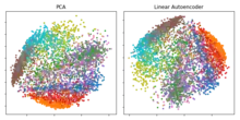 Plot of the first two Principal Components (left) and a two-dimension hidden layer of a Linear Autoencoder (Right) applied to the Fashion MNIST dataset.[28] The two models being both linear learn to span the same subspace. The projection of the data points is indeed identical, apart from rotation of the subspace - to which PCA is invariant.
