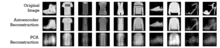 Reconstruction of 28x28pixel images by an Autoencoder with a code size of two (two-units hidden layer) and the reconstruction from the first two Principal Components of PCA. Images come from the Fashion MNIST dataset.[28]