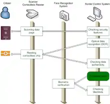 In the gate configuration, an incoming passenger places their passport data page either on or under a scanner, looks at a camera that will take a live picture to compare to the picture in the passport, and walks through a set of barriers that will open if the citizen's identity is verified. At either the passport scan or photo stage, if either identity cannot be verified or a malfunction happens, an immigration officer will step in at that point. Fingerprint and/or iris scans can also be taken depending on the system.[2] In the kiosk and gate configuration, a passenger approaches a kiosk for a facial, finger and passport scan. They then proceed to a set of doors and pass through using their fingerprint. In the mantrap kiosk configuration, a passenger walks through a first set of barriers to a kiosk for a facial, finger and passport scan. They then proceed out through a second set of barriers.