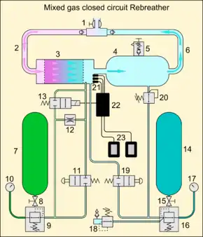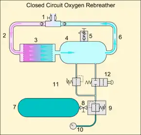 Closed circuit diving rebreathers may be manually or electronically controlled, and use both pure oxygen and a breathable mixed gas diluent.[12]