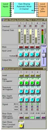 Automixers balance multiple sound sources based on each source's level, quickly and dramatically adjusting the various signal levels automatically.[2] Automixers are used in live sound reinforcement to maintain a steady limit on the overall signal level of the microphones; if a public address system is set up so that one microphone will not feed back, then, in general, multiple microphones will not feed back if they are automixed. The equivalent number of open mics (NOM) present at the output of the automixer is kept low, regardless of the actual number of mics in use.[3]