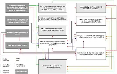 The a-Navigation (autonomous navigation) technology in its scheme uses not only new developments. It assumes the maximum use of existing technical and navigation systems on board, incl. mandatory ones. Thus, the widely used Unattended Machinery Spaces equipment, which does not require the constant presence of the crew in engine rooms[21] and mandatory equipment on board are integrated in a single complex with the key a-Navigation systems[22]