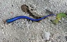 Some lizards,[4][5][6][7][8][9][10][11] salamanders[12][13][14] and tuatara[15] when caught by the tail will shed part of it in attempting to escape. In many species the detached tail will continue to wriggle,[16] creating a deceptive sense of continued struggle, and distracting the predator's attention from the fleeing prey animal. In addition, many species of lizards such as Plestiodon fasciatus, Cordylosaurus subtessellatus, Holaspis guentheri, Phelsuma barbouri, and Ameiva wetmorei have elaborately colored blue tails which have been shown to divert predatory attacks toward the tail and away from the body and head.[17] Depending upon the species, the animal may be able to partially regenerate its tail, typically over a period of weeks or months. Though functional, the new tail section often is shorter and will contain cartilage rather than regenerated vertebrae of bone,[18][19] and in color and texture the skin of the regenerated organ generally differs distinctly from its original appearance. However, some salamanders can regenerate a morphologically complete and identical tail.[20] Some reptiles such as the crested gecko do not regenerate the tail after autotomy.