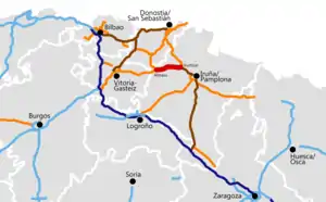 The Autovía A-10 (also known as Sakanako Autobia) is an autovía in Navarre.[1] It is 29 kilometres (18 mi) long and runs from the Autovía A-15 at Irurtzun to the Autovía A-1 at Altsasu. Built between 1992 and 1995 as an upgrade of the N-240 road, it received the A-10 designation in 2003 as part of the general renumbering of Spanish autovías.[2]