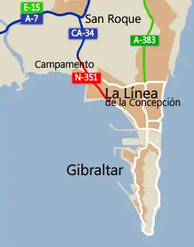 The Autovía CA-34 is an autovía in the province of Cádiz, Andalusia, Spain, providing a link between the Autovía A-7 and Gibraltar. It runs for 3 km (2 miles) between the A-7 at San Roque and the village of Campamento. Thereafter, it continues for a further 4 km (2.5 miles) as a national road, the N-351, through Campamento and along the west side of La Línea de la Concepción to the checkpoint at the border with Gibraltar. Once pass checkpoint vehicles enter Gibraltar onto Winston Churchill Avenue.