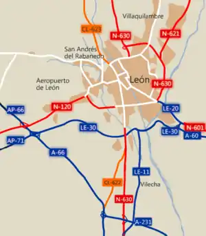 Autovía LE-30 is an autovía in the city of León, Castile and León, Spain. Designed as a beltway or orbital road, it is the outer ring and runs around the south edge of the city. Starting in the east at the A-60/N-601/LE20 junction, it runs west for a distance of 10 kilometres (6 miles) and becomes the Autopista AP-71 at the Autovía A-66/Autopista AP-66 interchange. The highway was constructed in two sections: from N-601 to N-630 (exit 4, Avenida de Antibióticos); and then the remainder to the Virgen del Camino interchange (exits 9A/B).