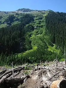 In contrast to powder snow avalanches, wet snow avalanches are a low velocity suspension of snow and water, with the flow confined to the track surface (McClung, first edition 1999, page 108).[4] The low speed of travel is due to the friction between the sliding surface of the track and the water saturated flow. Despite the low speed of travel (≈10–40 km/h), wet snow avalanches are capable of generating powerful destructive forces, due to the large mass and density. The body of the flow of a wet snow avalanche can plough through soft snow, and can scour boulders, earth, trees, and other vegetation; leaving exposed and often scored ground in the avalanche track. Wet snow avalanches can be initiated from either loose snow releases, or slab releases, and only occur in snowpacks that are water saturated and isothermally equilibrated to the melting point of water. The isothermal characteristic of wet snow avalanches has led to the secondary term of isothermal slides found in the literature (for example in Daffern, 1999, page 93).[7] At temperate latitudes wet snow avalanches are frequently associated with climatic avalanche cycles at the end of the winter season, when there is significant daytime warming.