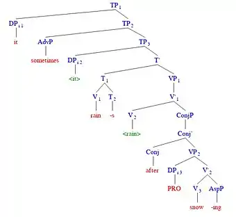 Noam Chomsky identifies two types of arguments, "true arguments" and "quasi-arguments".[4] True arguments have the capacity to be referential, as in the example it is on the table.[4] Here, the pronoun it is referential, that is, it refers back to something that exists in the real world. Quasi-arguments, on the other hand, are not true arguments in the sense that they do not possess referential qualities, but do behave like arguments in the sense that they can control PRO. Chomsky claims that "weather it" is a quasi-argument, as in the phrase It sometimes rains after [α snowing], where α represents PRO, which is controlled by weather it (see Figure 3).[4] PRO typically takes on the "referential properties of its antecedent", but in this case the antecedent, weather it, is not referential.[4] Conversely, he also identifies "non-arguments" which are not meaningful semantically, but do provide a syntactic function.[4] In the phrase it seems that John is here, it is what Chomsky refers to as "pleonastic it," which is neither referential, nor does it ever govern PRO.[4] (N.B. In the above example, while "seems" requires the insertion of pleonastic it, it cannot be truly be described as a verb of zero valence, because it takes the clause that John is here as its complement.) In English, if there is no meaningful subject, a pleonastic (such as it) must be inserted into the subject position in order to satisfy the Extended Projection Principle (EPP) which states that a tensed clause requires a subject.[8] For Chomsky, "weather it" is neither a pleonastic, nor is it a true argument, it is a quasi-argument.