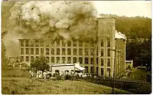 Just before 6 p.m. on June 15, 1911 a spinning mule box on the fourth floor of the mill overheated and caught fire.[3][10] Wind passing through the open windows fanned the flames and increased the severity of the fire. The mill was just about to close for the day when the fire was discovered, and few employees were in the building at the time. One man vainly attempted to control the blaze by throwing water onto it.[10] The mill had a modern fire sprinkler system, but its water pumps failed and the entire complex burnt down[13] in a few hours.[10] Though it was fully insured, Fries decided not to rebuild it and instead reinvested the insurance payout in the Mayo Mill, transferring his employees and resources there.[3] Almost all of the company houses were put on logs and rolled by mules and horses to Mayodan.[14][10] By 1913 only the Moravian Church, the mill store, and a single house remained in Avalon. The former two were dismantled and their lumber taken to Mayodan. The house was left behind to host the caretaker of the mill's power plant.[10] In 1916, Fries briefly returned to the site of the mill to dismantle the dyeing equipment and transport it to the Mayo Mill.[15]