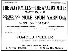 In 1887, Francis Henry Fries, a prominent businessman from Winston-Salem, constructed the Roanoke and Southern Railway, which stretched from his home town to Roanoke, Virginia. Seeking to develop industry along the rail line, Fries erected the Mayo Mill adjacent to the Mayo River in 1895 and established the town of Mayodan.[2] The Mayo Mill could not keep up with demand for yarn, so from 1899 to 1900 a new mill was built two miles to the north.[3] W. C. Ruffin, the superintendent of the Mayo Mills Company, gave it the name Avalon,[4] after Avalon, California.[3] Construction was undertaken by S. S. Ordway & Sons, an independent contractor.[5] At the time the four-story building was the largest textile mill in North Carolina. The south wall of the main building was made of wooden planks so it could be dismantled to allow for expansions and renovations.[6]