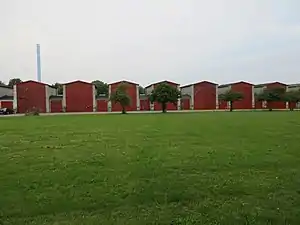 The two red painted hangars from 1917 were listed in 1976.[1] They were constructed in timber so that they could easily be burned down in the event of war. The site also features an engine testing facility from 1943. Almost a hundred metres long, it consists of a row of 10 interconnected testing halls. A vintage aircraft from 1958 has been installed on the top of a column in front of the buildings.