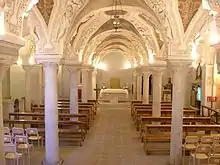 The coffered ceiling of the central nave, which covers the ancient ceiling beams, was installed in the 17th century. In the centre is the large canvas by Michele Ricciardi depicting the Assumption of the Virgin (1702–1705). To the sides in four medallions are depicted elements recalling the Marian Litany of Loreto: a house, a star, a tower and a rose.