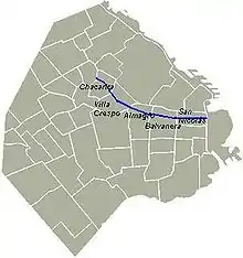 It extends 69 blocks from Eduardo Madero Avenue in the eastern Puerto Madero neighborhood to the West and later to the Northwest, and ends at Federico Lacroze Avenue in the Chacarita neighborhood. Automobile traffic runs from west to east. Line B of the Buenos Aires Metro runs most of its length underneath the street.