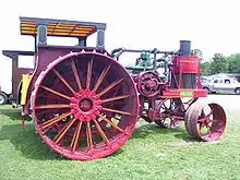 Avery started building agricultural trucks in 1910. Early truck manufacturers were uncertain how to market their product and whether they should just be used to haul goods or should also be useful in the field. Avery described its truck as a 'gasoline farm wagon' and 'general farm power machine' for city, town, and country hauling. Their advertising suggested the farmer could use it to haul livestock, grain, hay, and other loads, as to pull plows, road graders, harrows, discs, binders, and other farm machinery, as well as loaded wagons.[4] The truck weighed 1 short ton (0.91 t) and featured a four-cylinder engine, open cab and chain drive. Its wheels had wooden spokes and rims, while the steel tires were 1.5 inches (38 mm)x5 inches (130 mm) wide.[4] Avery figured farmers could get the most use out of the machines during the harvest season. Their tractor trucks included a large belt pulley that could be attached to the front crank shaft, useful for powering grain separators and other belt-driven machines. Early models had cast steel wheels with holes. Wooden plugs were driven into the holes to provide added traction. When the wooden plugs wore down, the owner simply replaced them with new wooden plugs.[8]